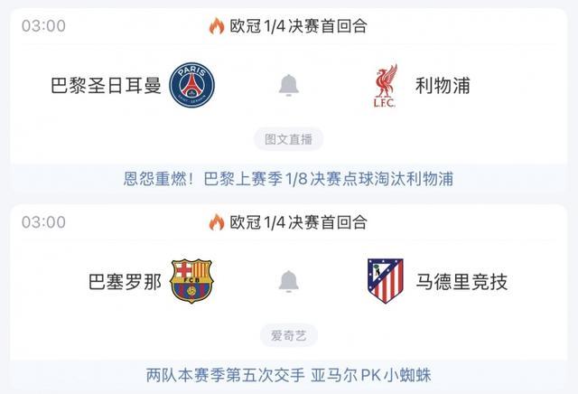 明天凌晨03:00,欧冠1/4决赛首回合继续进行,巴黎主场大战利物浦,连续两个赛季欧冠淘汰赛相遇!巴萨主场迎战马竞,两队迎来本赛季第五次交手!